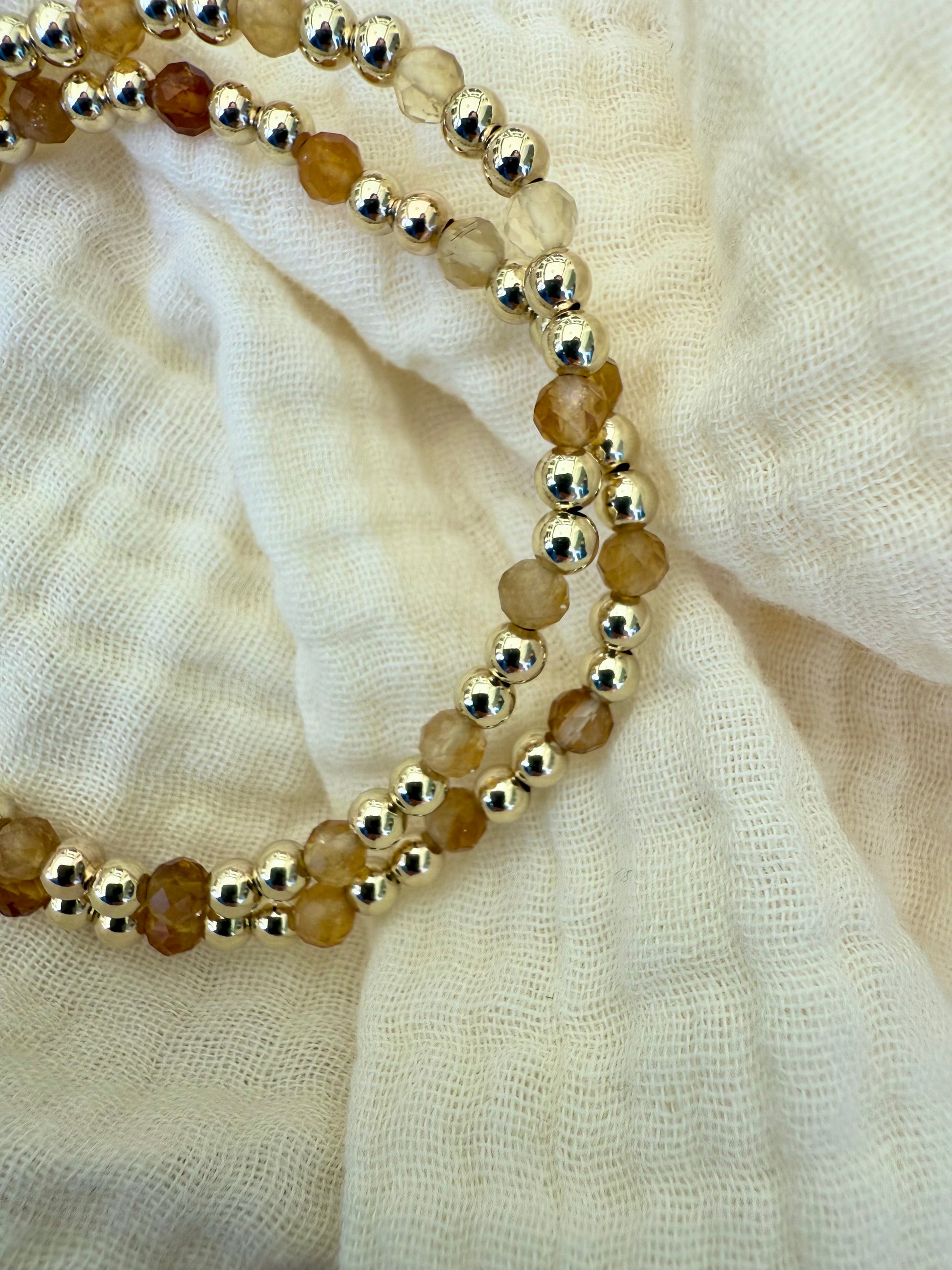 These bracelets are hand strung on a durable, stretchy cord with highest quality 14k gold filled or sterling silver beads and citrine stones. They are meant to last without tarnishing or turning your skin green.